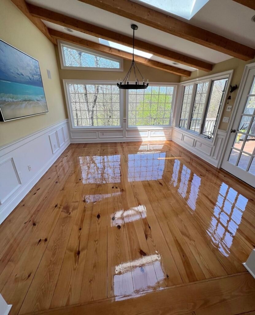 Finalizamos com o sistema Bona Brasil. O selador à base d’água fecha os poros, seguido de duas demãos de verniz Traffic HD, respeitando o tempo de secagem de 3 horas entre camadas.
